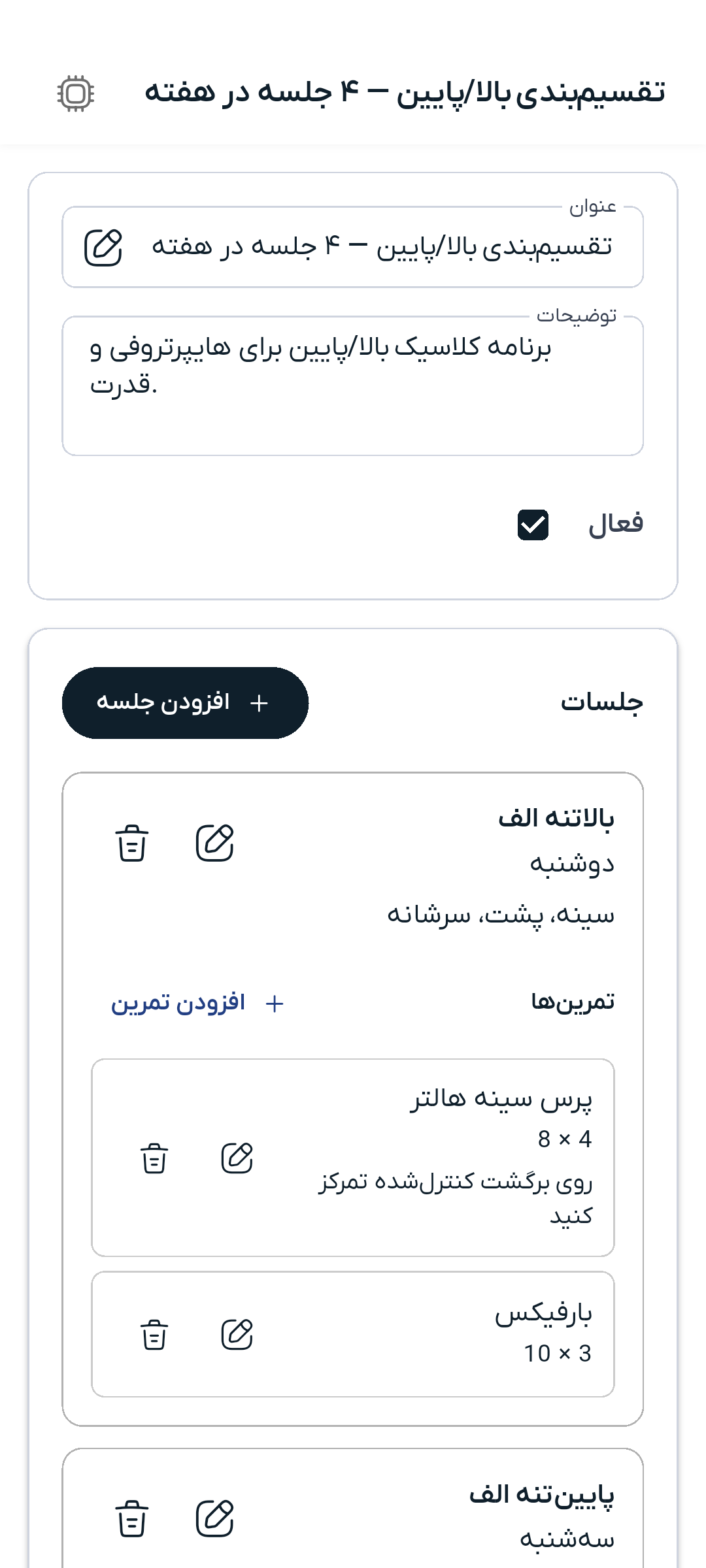 ۱. به تمرین → برنامههای تمرینی بروید ۲. روی + ضربه بزنید ۳. یک نام انتخاب کنید (مثلاً «پوش/پول/پا»، «اسپلیت ۵ روزه») ۴. ذخیره کنید — برنامه خالی شما آماده است